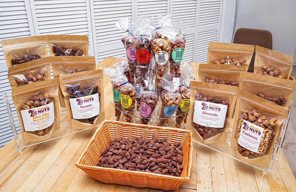 Gimme Nuts adapts the usual recipes to the taste and needs of almost anyone ( NO NUTS people please abstain!). Gimme Nuts creates this delicious treat with considerably less sugar than the original recipe, making them more tasteful of nuts and natural flavors and spices and less of sugar.. Gimme nuts is a vegan product.